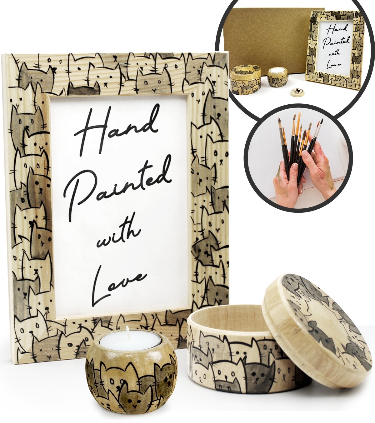 Hand-painted wooden gift set with cute cats: photo frame, round box, and candle holder. A cozy handmade décor gift for cat lovers and home aesthetics