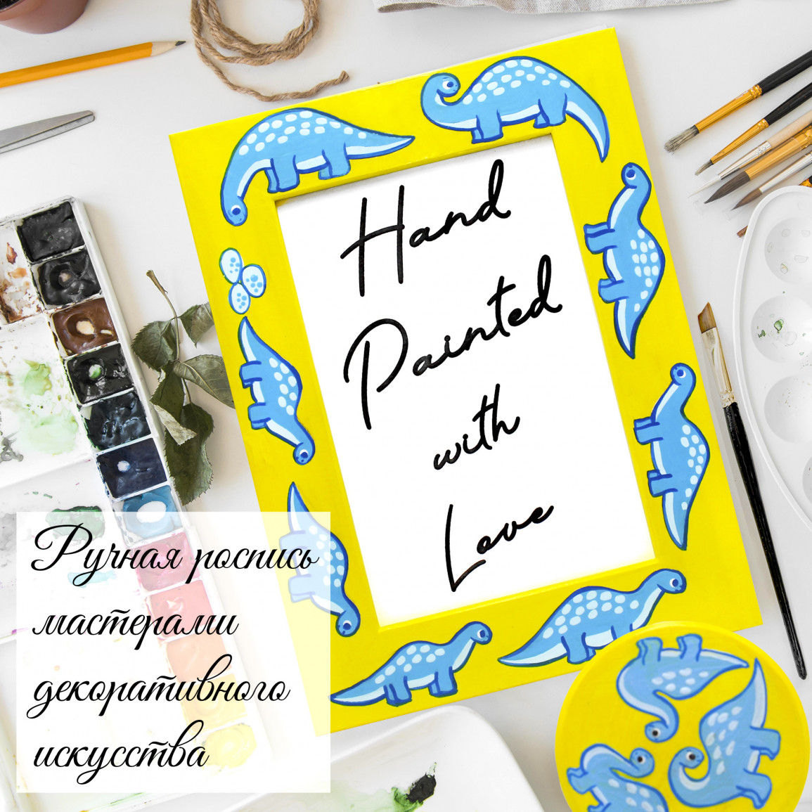 Hand-painted wooden gift set with photo frame 4x6 and round box. Bright dinosaur design, natural wood, safe water-based finish, decorative and practical