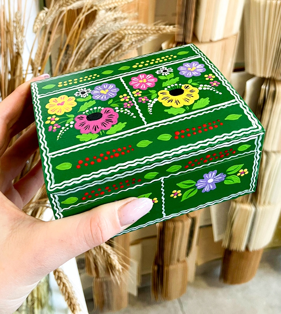 The hand-carved wooden stork symbolizes harmony and good fortune, making it a cherished element of Belarusian culture. The box painted in the Ogovo style reflects recognisable Polesia motifs and adds a vibrant decorative accent to any home. The round box with straw inlay showcases the unique mastery of Belarusian artisans. The painted candle holder brings warmth and colour to seasonal décor, while the magnet with cornflowers and the «Belarus» inscription serves as a bright reminder of the country’s nature and cultural symbols. The pair of hand-painted figurines highlights the charm of traditional folk costumes and festive heritage.
