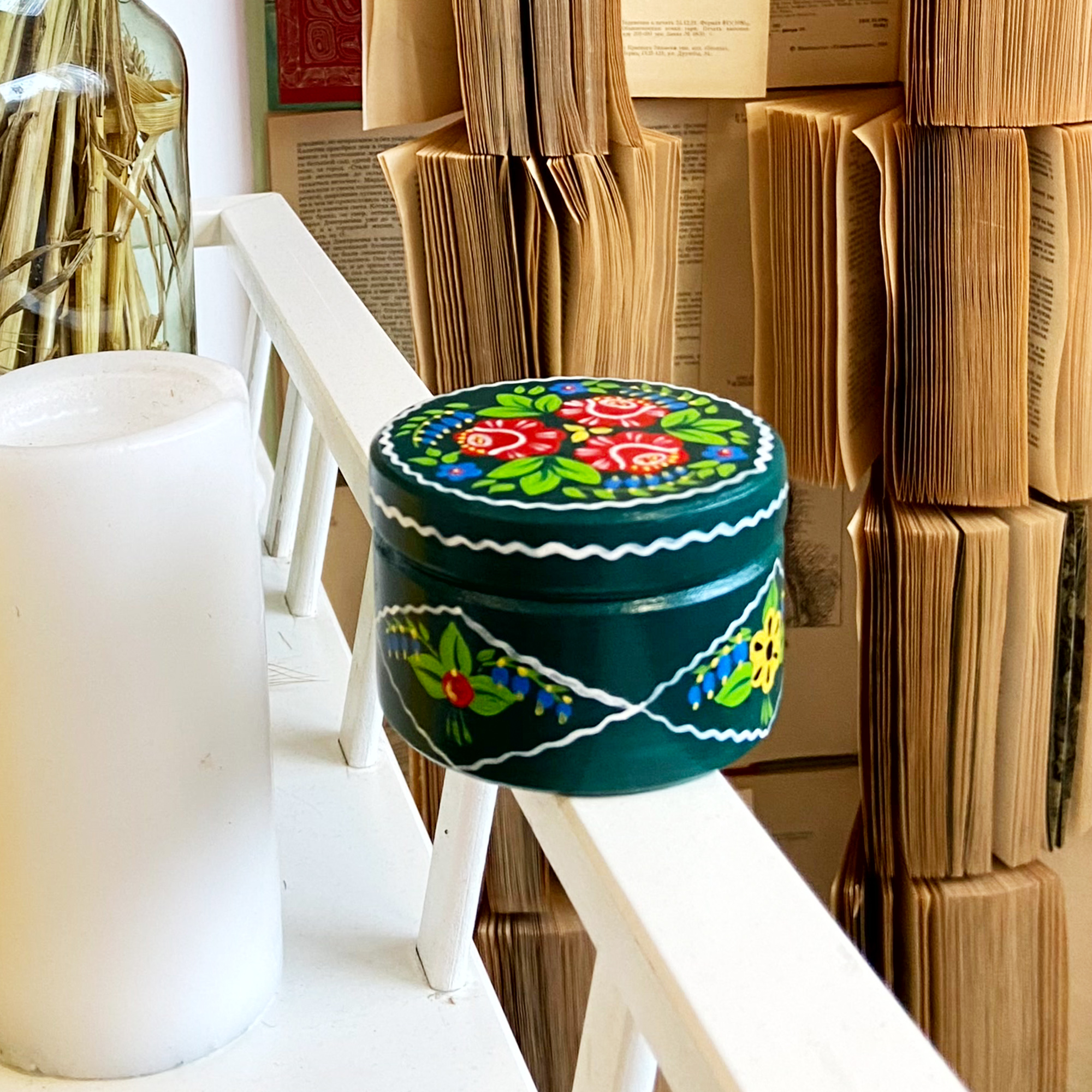 This round wooden box with floral and leaf painting is a perfect choice for those who appreciate unique and aesthetic items. Each piece is handmade on natural wood, making it vibrant and one-of-a-kind. The hand-painted design highlights the natural warmth and folk spirit, turning the box into a true interior decoration.